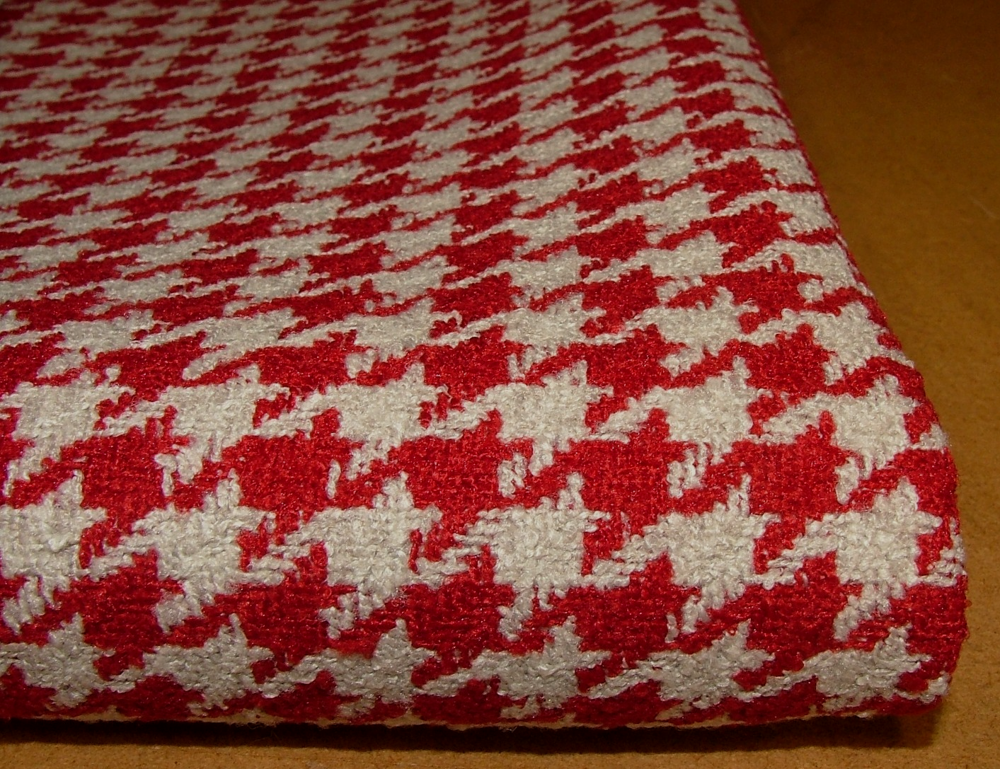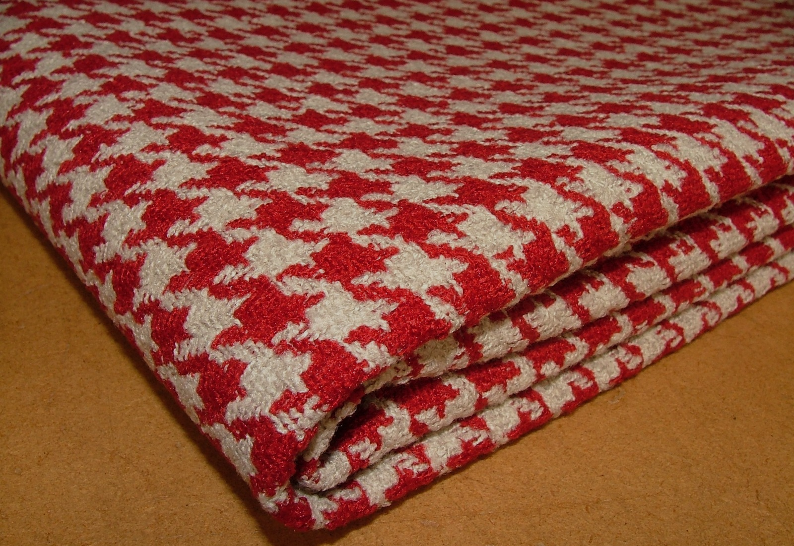 Fabric Type - Heavy Weight Woven Design - Houndstooth Colour - Garnet Length - 107 cms Width - 140cms Pattern Repeat - 2cm Composition - 100% Polyester With FR Coating Martindale Rub Test - 80,000 Heavy Domestic Flame Retardant - Yes Use - Upholstery Cushions Soft Furnishings Etc