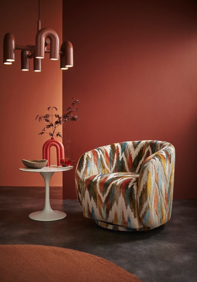 Omega stands out with its chevron-striped velvet, merging bohemian charm with contemporary